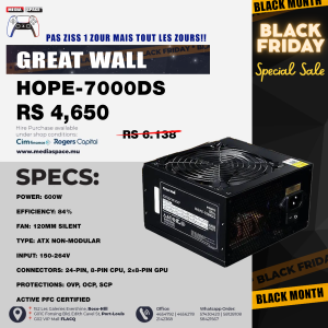 The Great Wall HOPE-7000DS 600W is a high-performance power supply built for reliable and stable operation. Designed with Active PFC certification, it ensures efficient and clean power delivery for both gaming and office systems. Featuring a 120mm silent cooling fan, it keeps your system cool and quiet under load. The non-modular ATX design offers straightforward installation, while multiple protections — OVP, OCP, and SCP — safeguard your components from electrical risks. Ideal for users seeking performance, durability, and value.SKU: n/a -