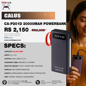 The CALUS CA-P201D Powerbank (20,000 mAh) is a high-capacity external battery designed to keep your devices powered throughout the day. It features fast charge support, dual-port output, and advanced safety protection. Slim and lightweight, it fits easily in your bag or hand for travel, commuting, or emergencies. Ideal for smartphones, tablets, and other USB devices, the CALUS powerbank ensures reliable performance and peace of mind with its 365-day warranty.
