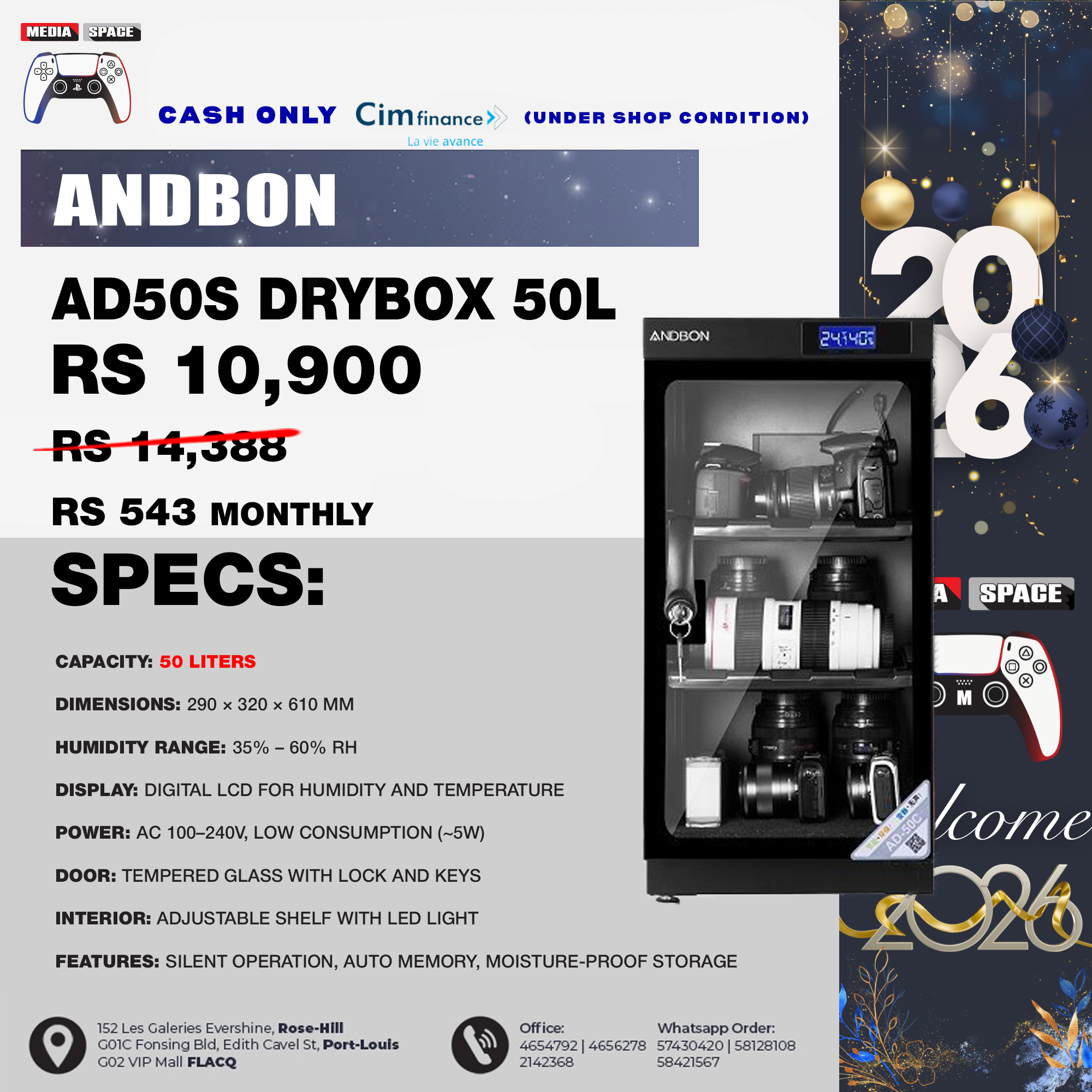 NEW PRODUCTS, Pro Gear, Studio Equipment, Summer Sales 2025Andbon Ad-50S Dry Cabinet Box 50L Liters Digital Display with Automatic Humidity Controller, Auxiliary
