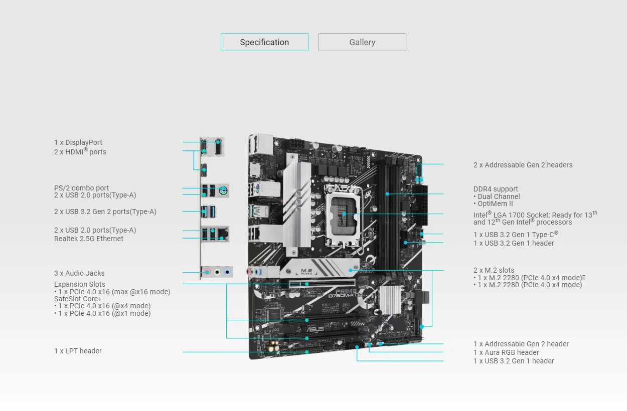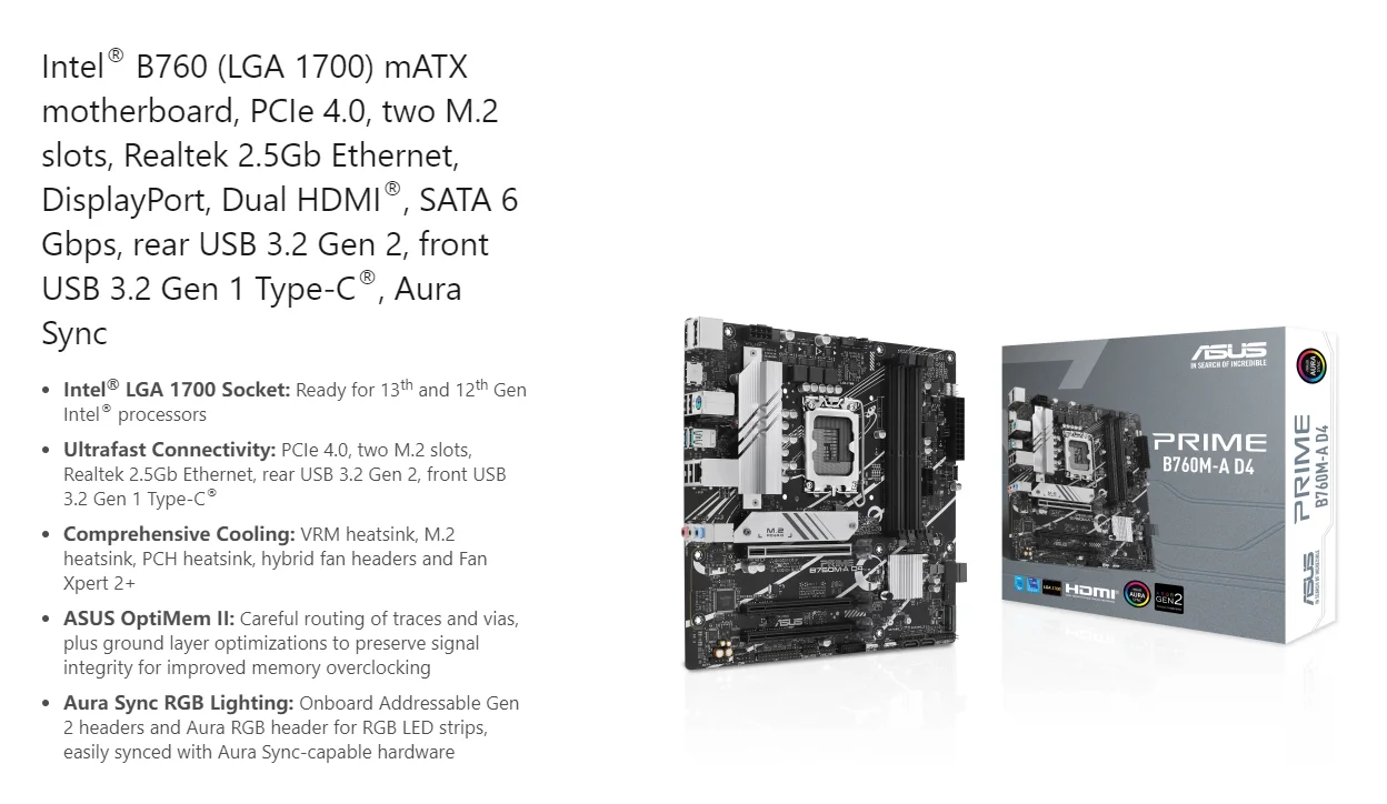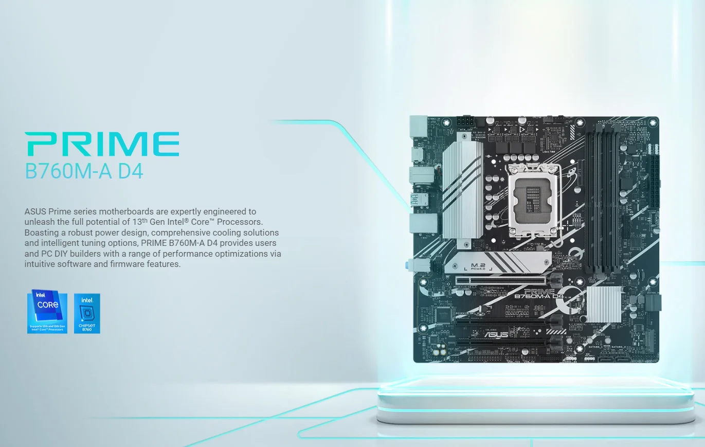 ASUS PRIME B760M-A D4 Intel B760 LGA 1700 mATX Motherboard with PCIe 4.0, DDR4, 2xM.2 Slots, Realtek 2.5Gb Ethernet, DisplayPort
