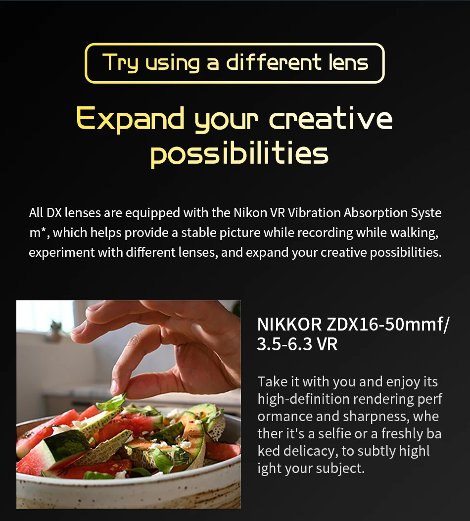 - Nikkor Z DX 16-50mm f/3.5-6.3 VR Lens (1 year warranty)