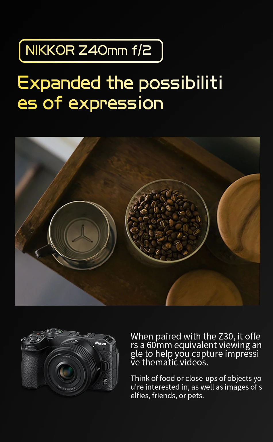Move beyond the smartphone camera vibe and take your video quality to the next level. The Nikon Z 30 mirrorless 4K digital camera with a 16-50mm lens is a user-friendly upgrade with a cinematic look and feel, spectacular video quality and features designed for creators, vloggers, influencers, and streamers. TechRadar rated it a Best Camera For Vlogging, calling it “A compact and intuitive tool for novice vloggers.” The Z 30 is the smallest camera in Nikon’s Z series, so it’s easy to use handheld or on a tabletop tripod. It has a flip-out screen with touchscreen control to ensure you’re always in frame, along with a convenient smartphone app that lets you control the camera remotely. The included NIKKOR Z DX 16-50mm f/3.5-6.3 VR wide-angle zoom lens has powerful image stabilization to keep your shots steady. Fast, reliable autofocus with several AF Modes can adjust to the quick shifts in detail found in unboxing videos, how-to’s, gaming streams, video tours, and tutorials. Plus, with eye-detection autofocus, the Z 30 can automatically track the eyes and faces of humans, cats or dogs and keep focus right where you want it. If the Z 30 is your entryway into Nikon Z series products, rest assured you can upgrade your lenses or add an external mic along the way to boost the quality of your content. And to help you make that step, Nikon also offers a Creator’s Accessory Kit with tripod, microphone, and remote (sold separately). When you buy from a Nikon Authorized Dealer, you also get the peace of mind of a limited two-years warranty from Nikon Inc.