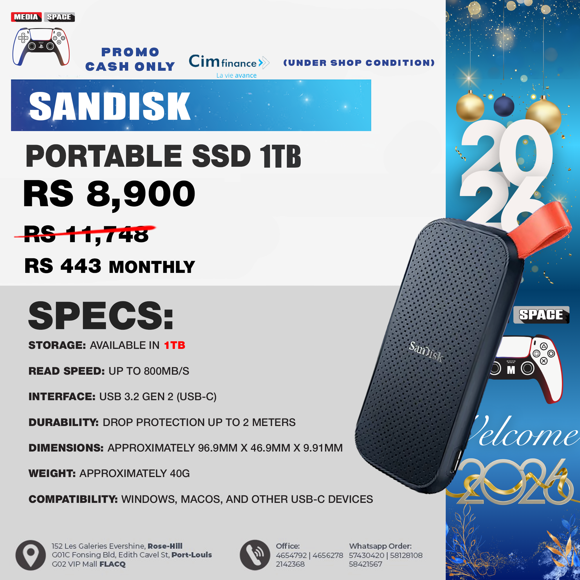 Camera SD cards, External Storage, NEW PRODUCTS, Storage, Summer Sales 2025SanDisk Portable SSD 1TB- Up to 800MB/s, USB-C, USB 3.2 Gen 2, Updated Firmware – External Solid State Drive – SDSSDE30-1T00-G26