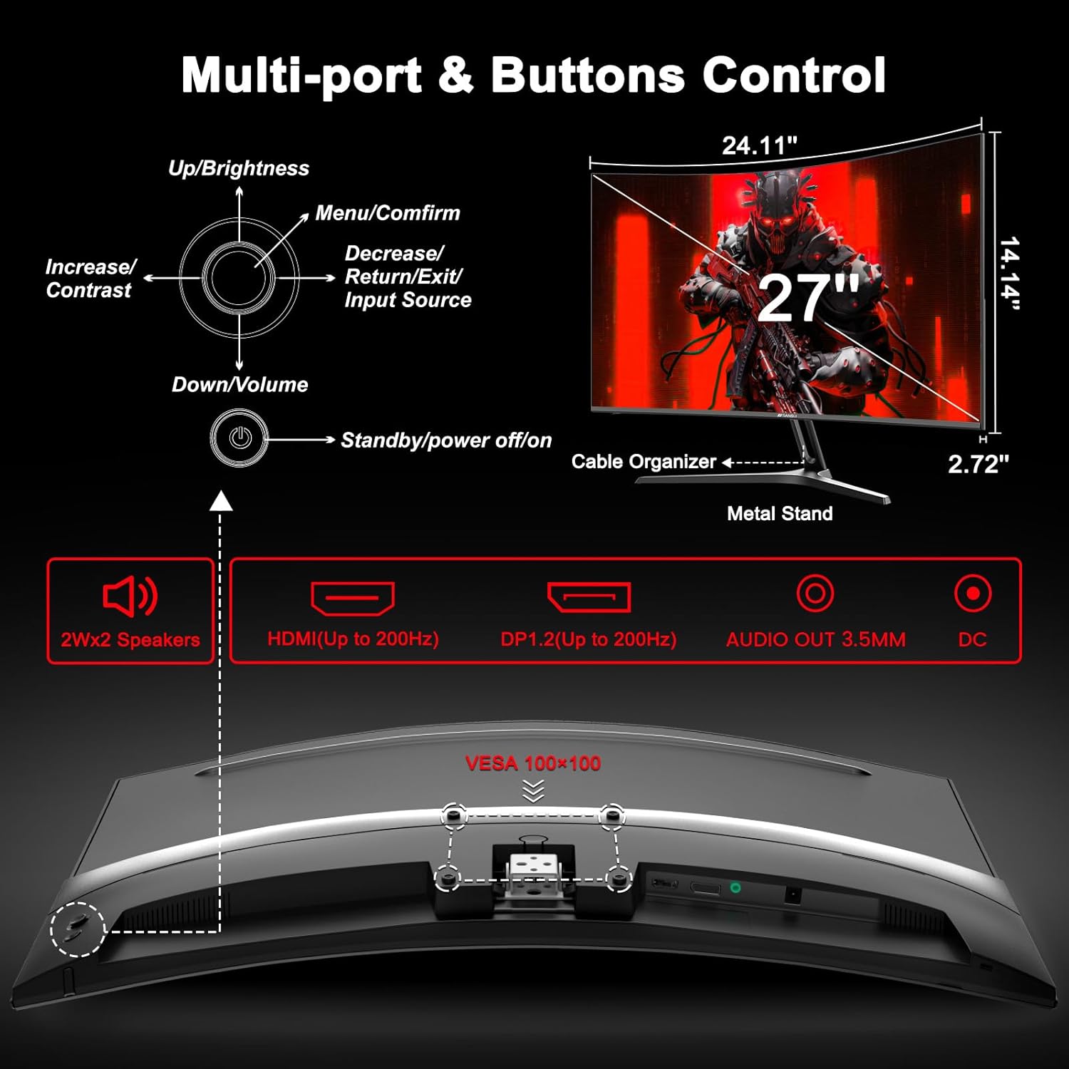 SANSUI ES-G27C1 Inch Curved Gaming Monitor 200Hz 1ms with Speakers FHD 1080P Computer Monitor FreeSync|1500R|130% sRGB|HDR|Low Blue Light|HDMI DP Ports|VESA Mount|Metal Stand(HDMI Cable Incl.)