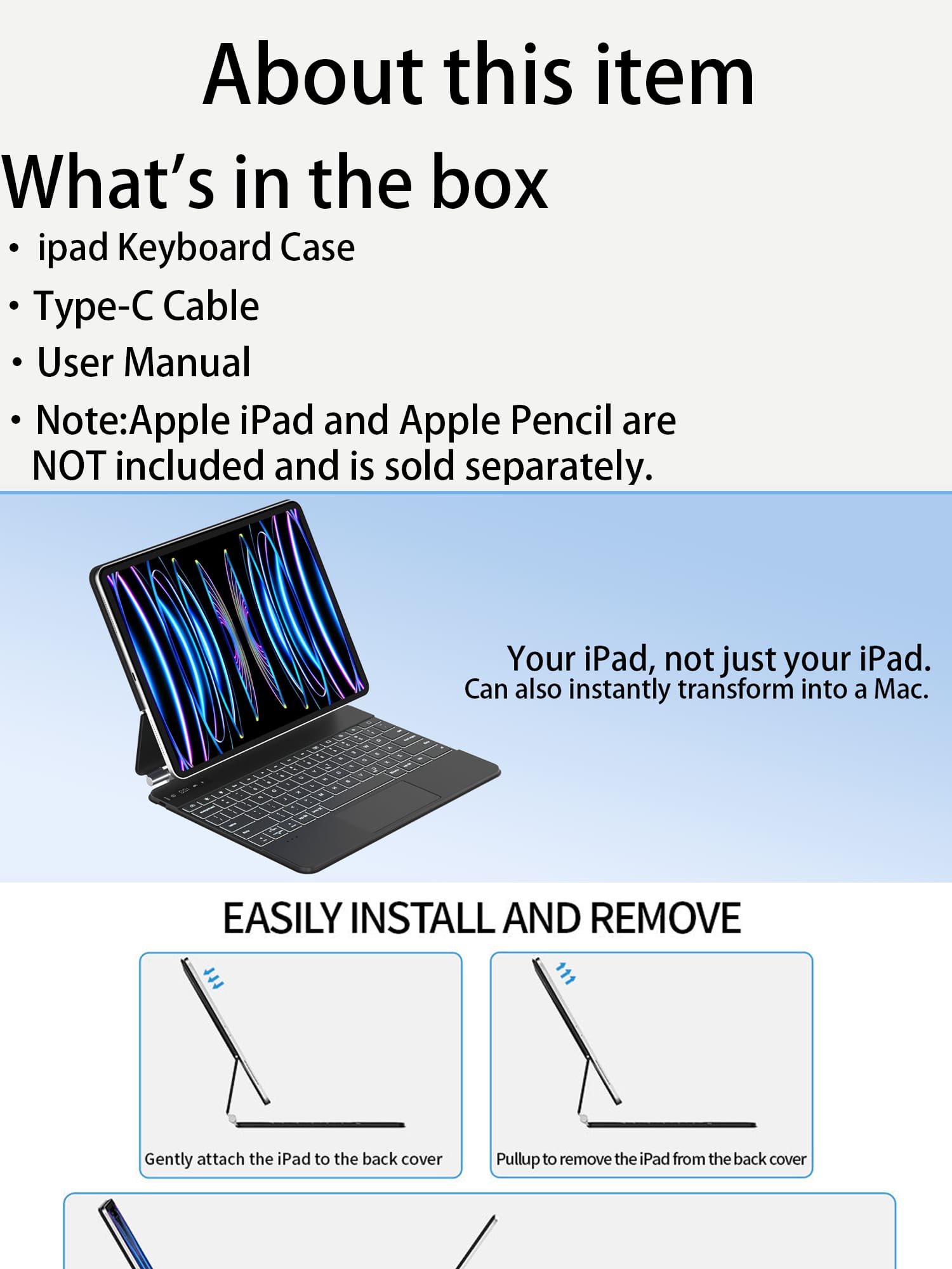 Smart Pencil Compatibility:Tailored for creative work, the keyboard supports Apple Pencil for precise control and versatile input.