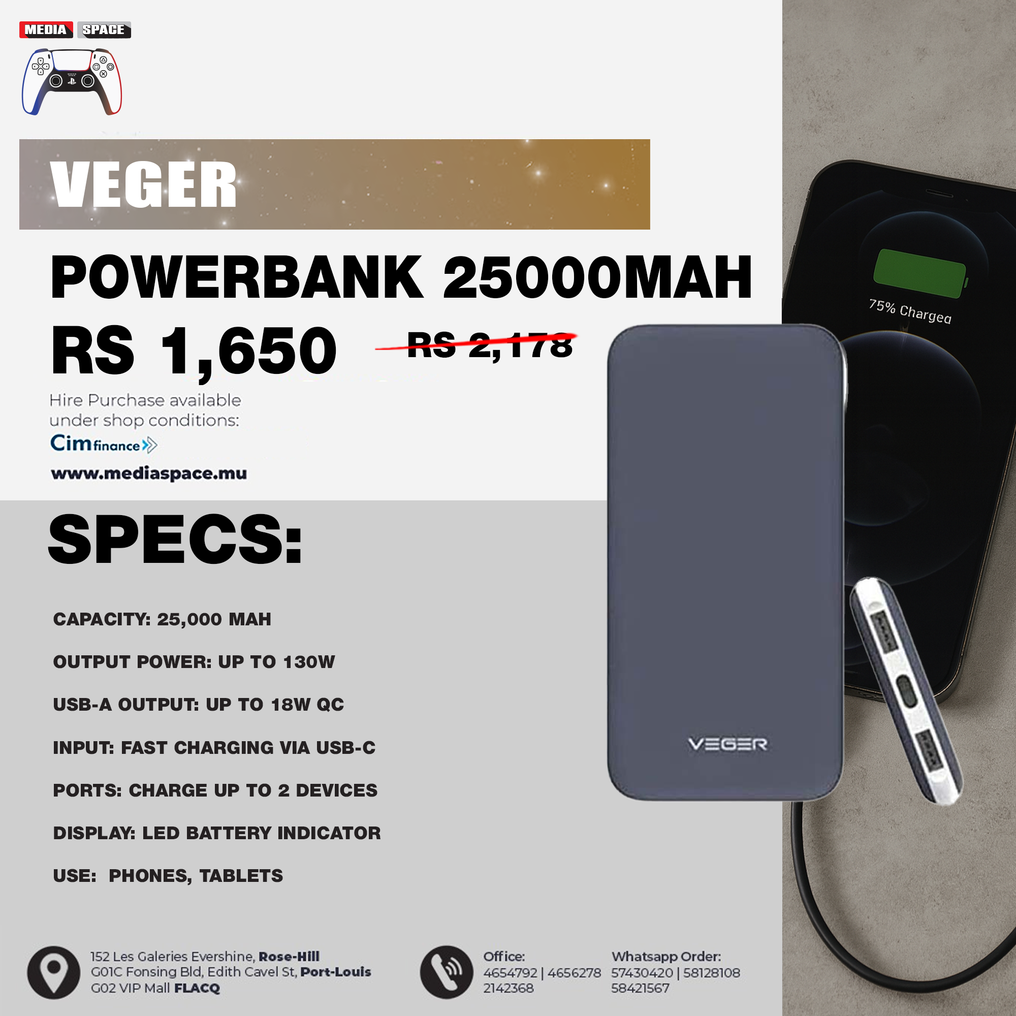 The VEGER Power Bank 25,000 mAh (V11) is a high-capacity portable charger designed for fast, reliable charging on the go. With dual USB outputs and smart power management, it can charge multiple devices simultaneously. Its compact, durable body and sleek matte finish make it perfect for travel, work, and outdoor use. Built-in safety protection ensures secure charging for phones, tablets, and other USB-powered devices.