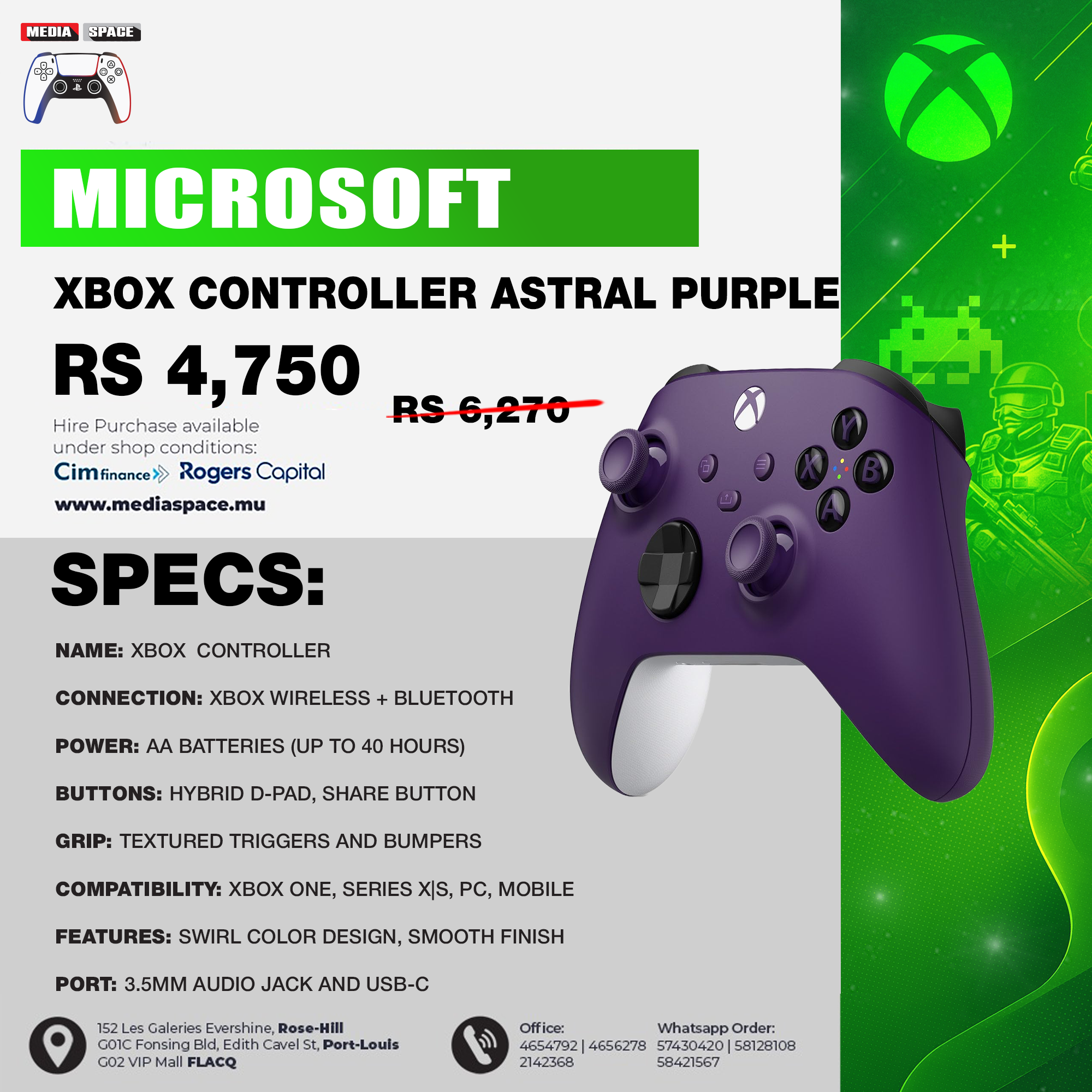 - XBOX ASTRAL PURPLE WIRELESS CONTROLLER: Experience the modernized design of the Xbox Wireless Controller in Astral Purple, featuring sculpted surfaces and refined geometry for enhanced comfort during gameplay with battery life up to 40 hours.