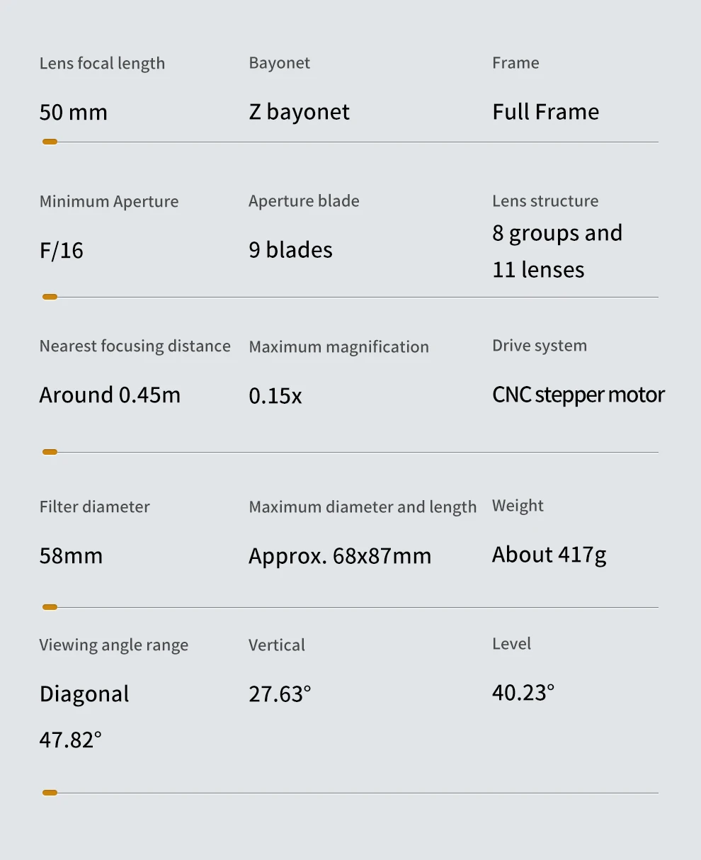 The lens adopts the aviation aluminum alloy as the housing main body, and is processed with surface anodic oxidation and sand blasting to make beauty and texture coexist and effectively improves the corrosion and wear resistance at the same time. The overall construction of the lens is compact, its maximum diameter and length is 68*87mm and the net weight is only about 417g, which is conductive to handhold shooting and video recording for a long time.