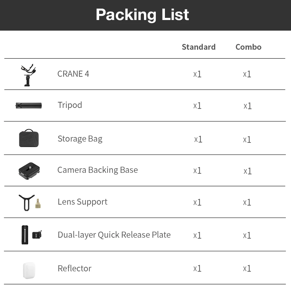 Specifications: Configured for: Smartphones, DSLRs, action photo cameras, mirrorless cameras Titling Angle: 330° Rolling Angle: 290° Panning Angle: 300° Communication: Bluetooth Axis: 3-Axis Features: |Gimbal Or Gimbal|Crane X Rahim| **Unmatched Stability and Versatility** The ZHIYUN Crane 4 Camera Stabilizer is a pinnacle of engineering, designed to provide unparalleled stability for a wide range of cameras. Whether you're a professional photographer or a hobbyist, this 3-axis handheld gimbal is the perfect tool for capturing smooth, steady footage. With a titling angle of 330°, rolling angle of 290°, and panning angle of 300°, the Crane 4 offers an impressive range of motion, allowing you to capture dynamic shots with ease. **Seamless Integration and Control** The ZHIYUN Crane 4 boasts seamless integration with your camera via Bluetooth, ensuring that you can control your shots with precision. The gimbal's lightweight design, combined with its robust construction, makes it an ideal companion for long shoots. The Crane 4's compatibility with a variety of cameras, including DSLRs, mirrorless cameras, and action photo cameras, makes it a versatile tool for any photographer's kit. **Enhanced Shooting Experience** The ZHIYUN Crane 4 is not just a stabilizer; it's an enhanced shooting experience. The gimbal's smooth operation and advanced features, such as the fill light, make it a valuable asset for portrait shooting. The gimbal's design is not only functional but also aesthetically pleasing, ensuring that it complements your camera setup. Whether you're shooting in the studio or on location, the ZHIYUN Crane 4 is the best gimbal for Sony camera, Canon, Nikon, and more, providing the stability and control you need to capture stunning footage.