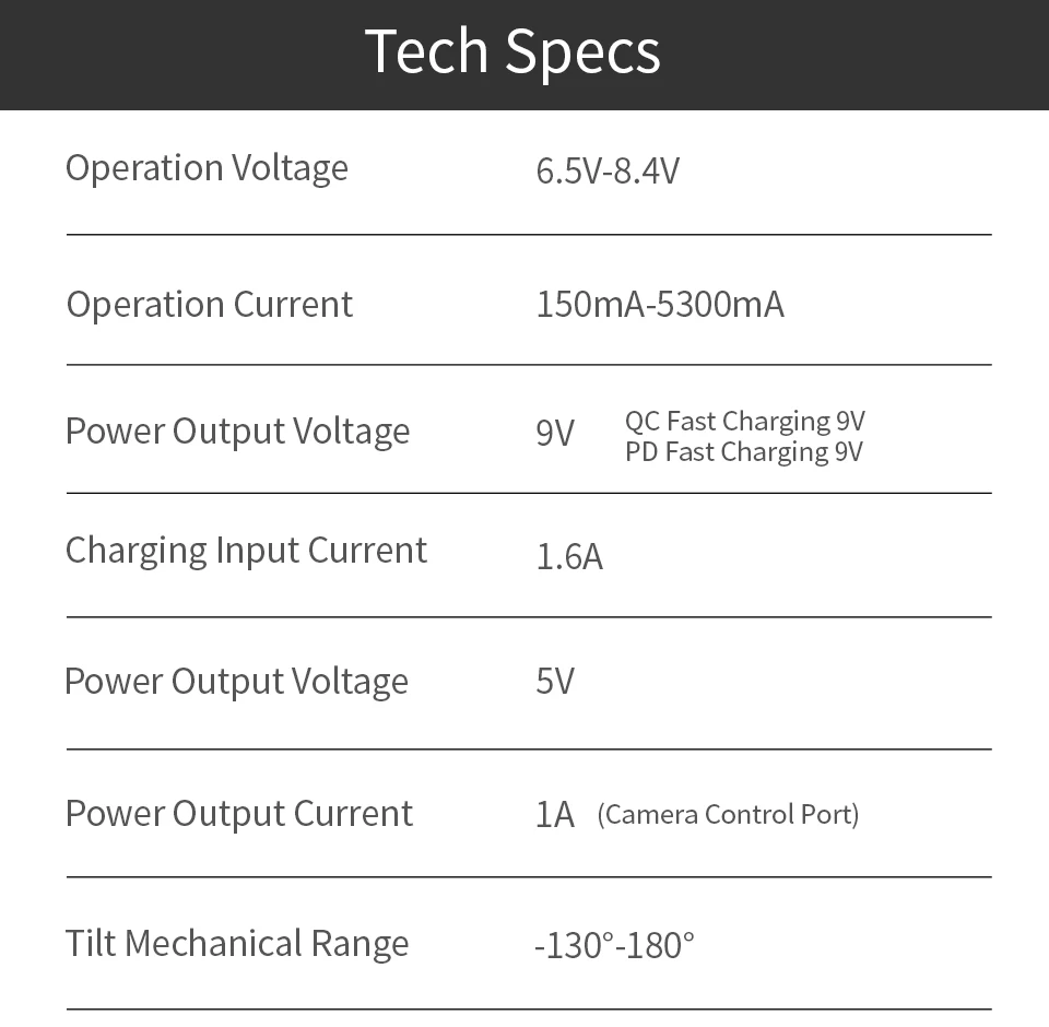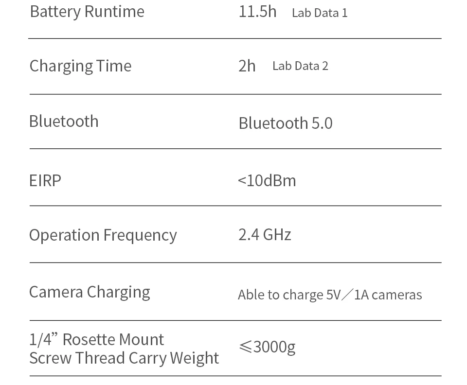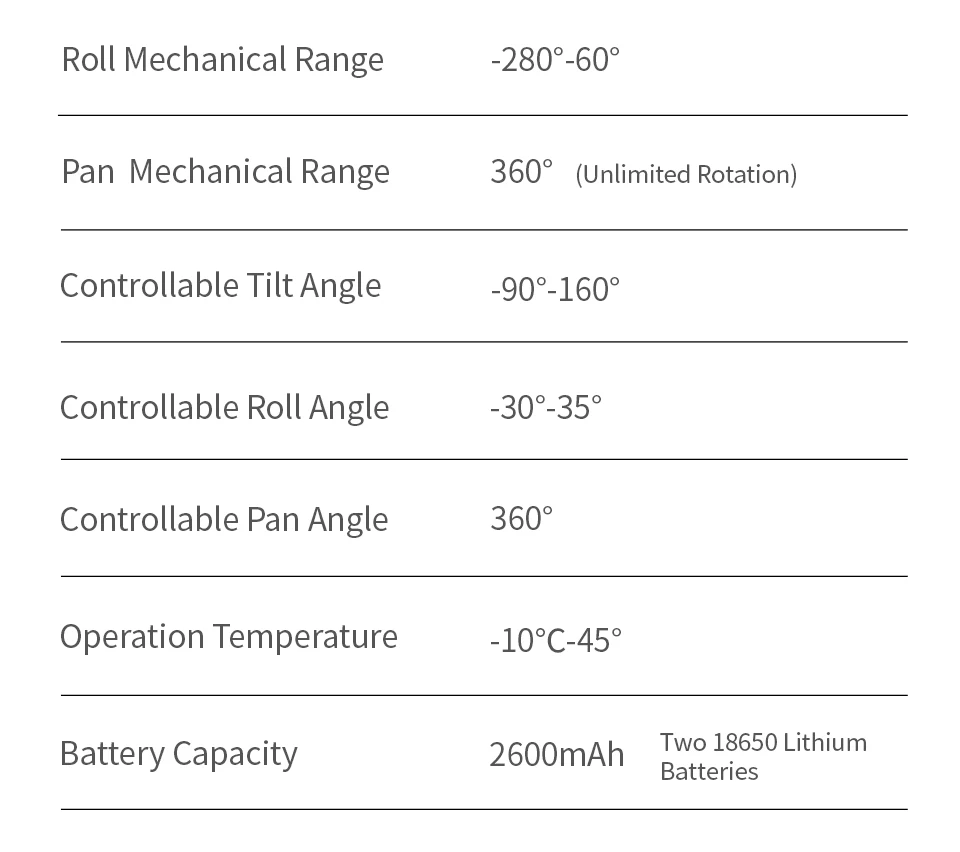 · Equipped with two 18650 batteries with a capacity of 2600mAh. It also supports 5V 1A camera power supply.