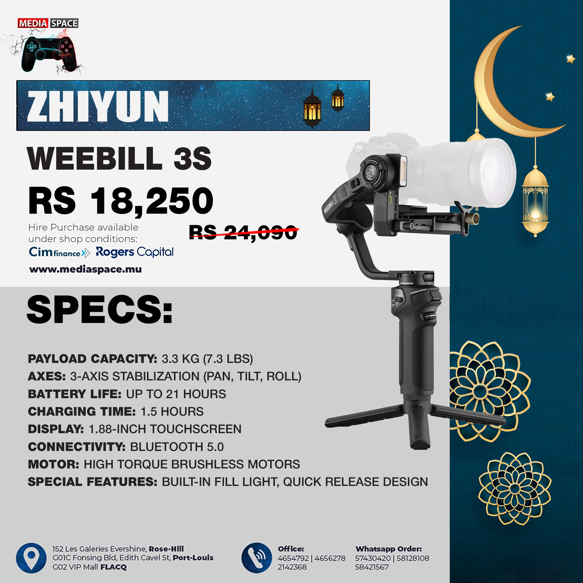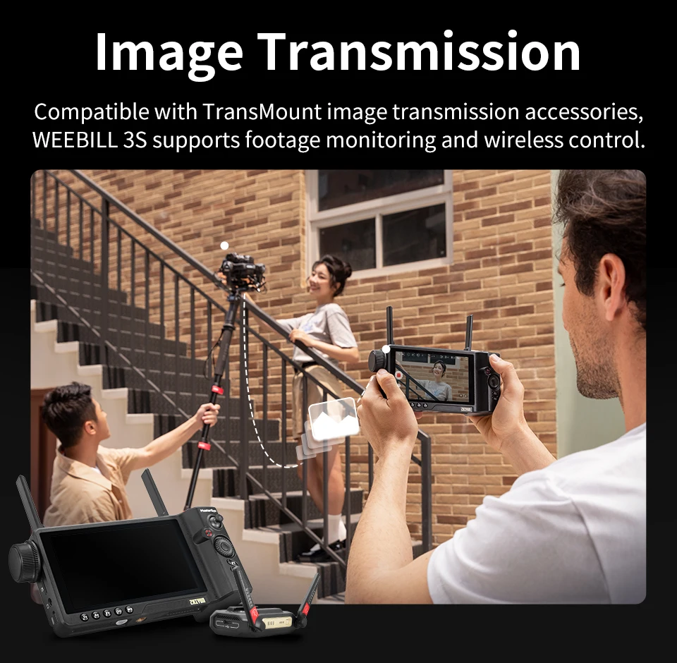 Compatible with TransMount image transmission accessories, WEEBILL 3S supports footage monitoring and wireless control.
