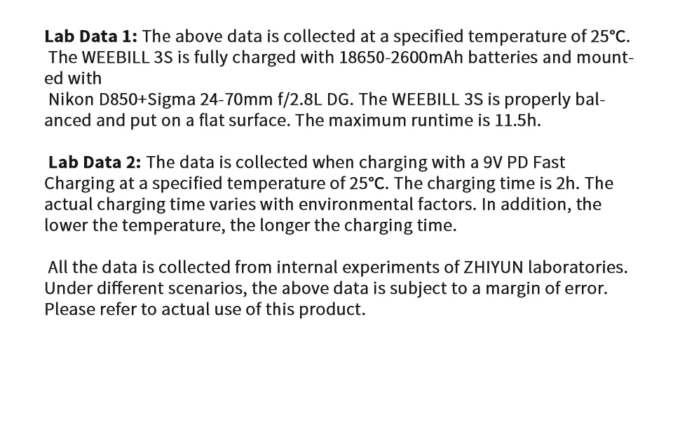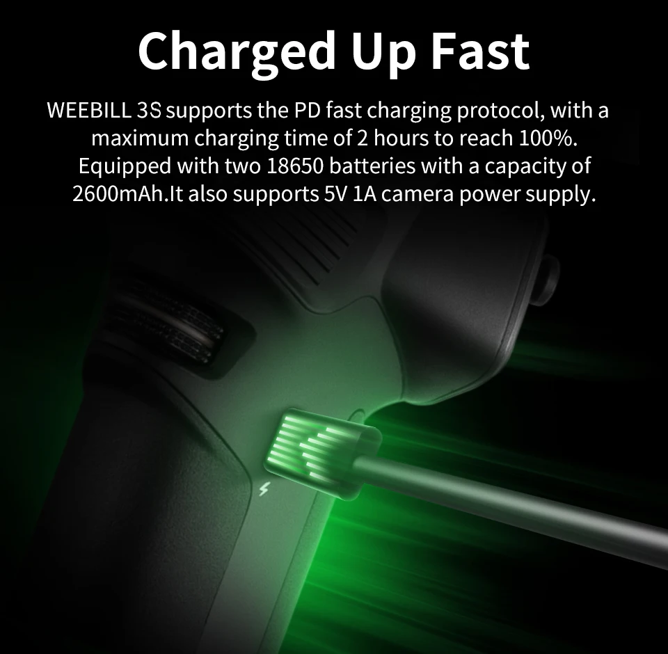 · WEEBILL 3S supports the PD fast charging protocol, with a maximum charging time of 2 hours to reach 100%.