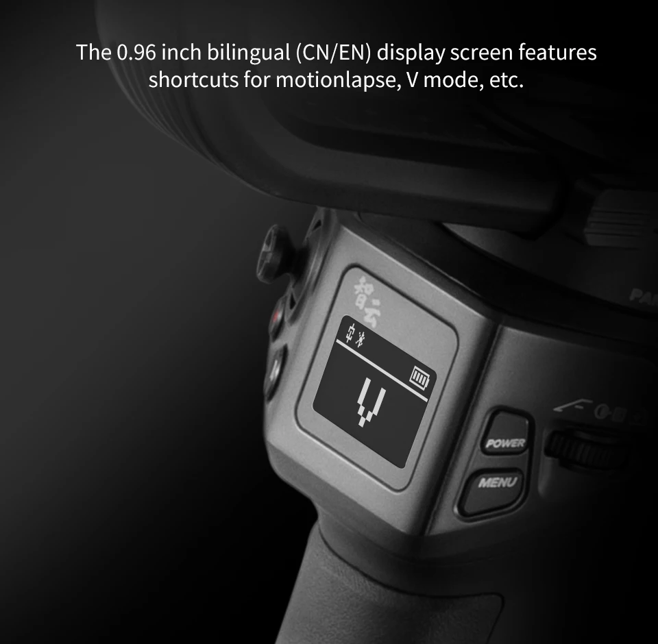 The 0.96 inch bilingual (CN/EN) display screen features shortcuts for motionlapse, V mode, etc.